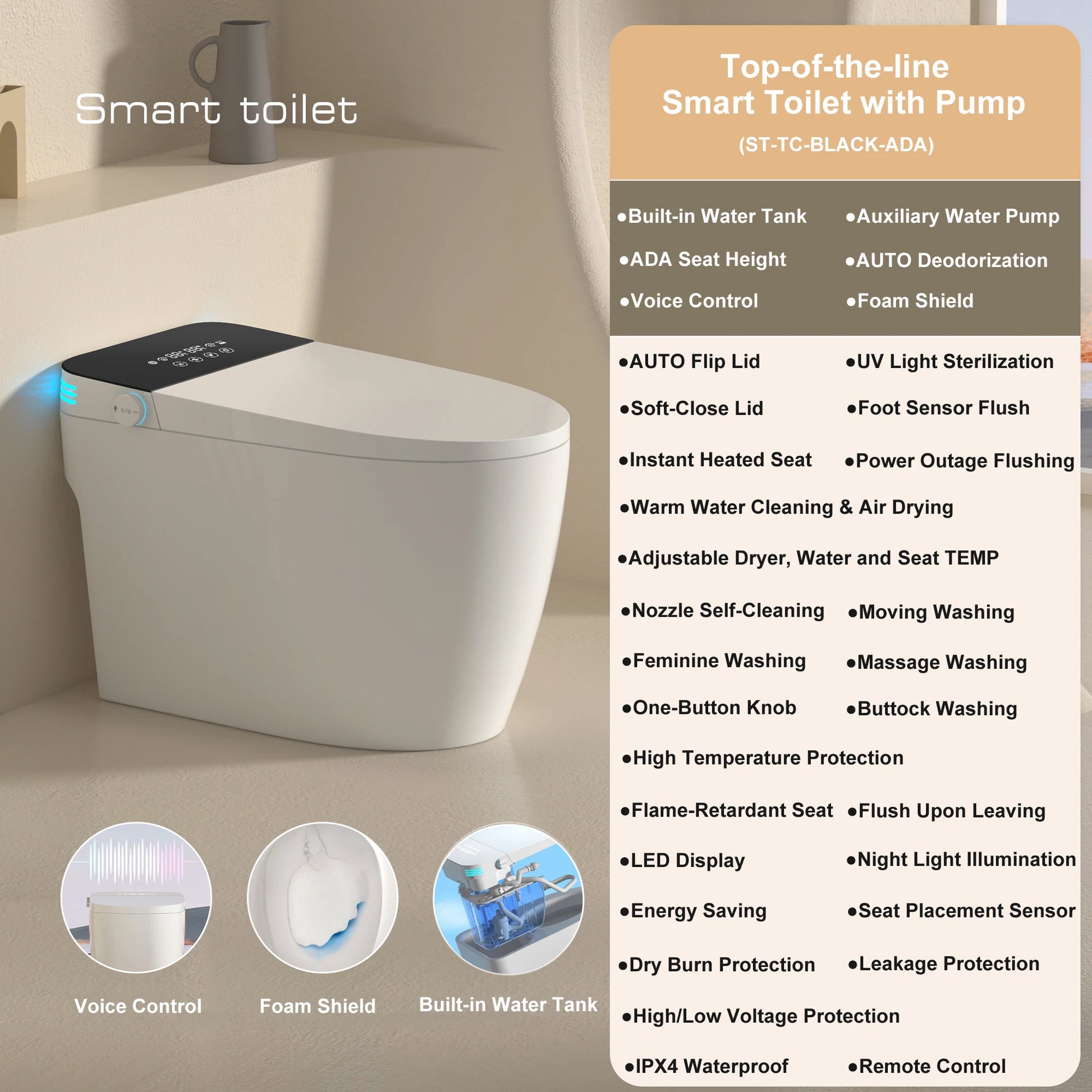 - Heated bidet seat with built-in dryer, foam shield to minimize splashes, remote control, voice control, and safety features like electrical leakage protection for reliable use.